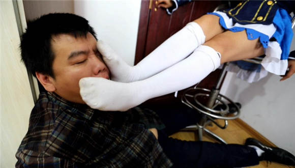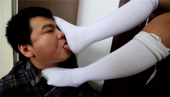 袜子不是配套的,蓝色条纹袜比较干净不太合适,就找了一双之前穿了很久的纯白色的,这双袜子脚底很黑巨臭无比,强迫闻袜子 脚插嘴深喉,舌头当脚垫一点一点的舔袜子。舔鞋底 鞋底也很脏 把鞋底的泥都舔干净