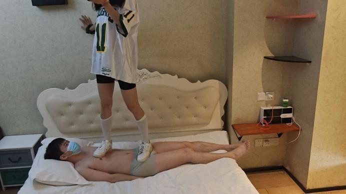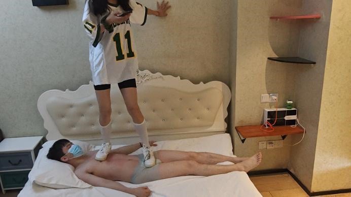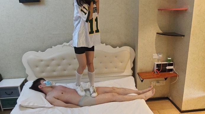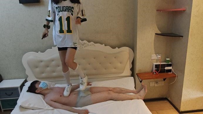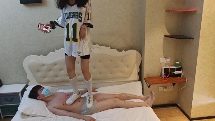 【影片预览及介绍说明】:自从上次在毯子身上跳舞之后,舞蹈小姐姐就沉迷上了,这次又来了,穿着一夏天的空军和三天的白丝就来了。各种在毯子身上跳舞,基本上都是踩在裆上,每次卡点就在裆上,丝毫不顾及毯子死活,感觉要被踩秃噜皮了,空军鞋底好硬,感觉别上次的靴子还要痛很多。