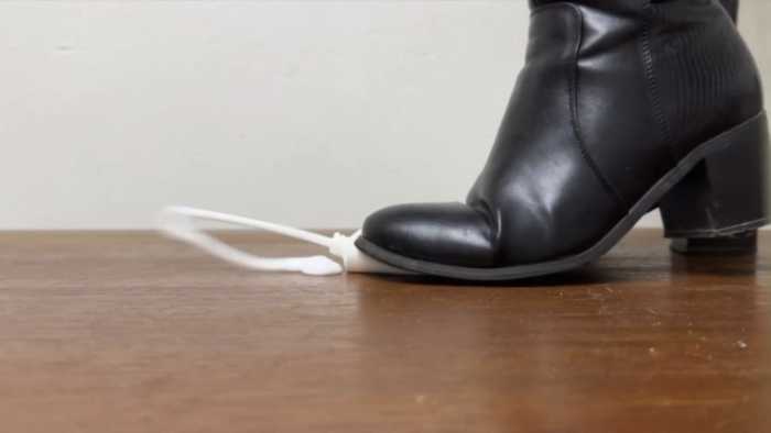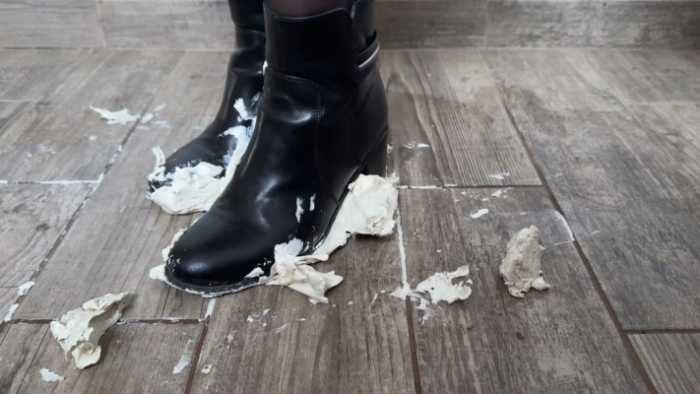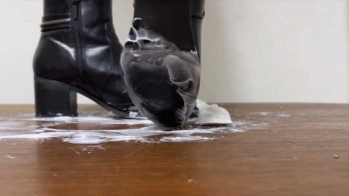 哥特美女非常酷的短靴踩爆护手霜和冰激凌,护手霜被踩喷了好远,冰激凌最后涂满了鞋子,黏黏糊糊的。